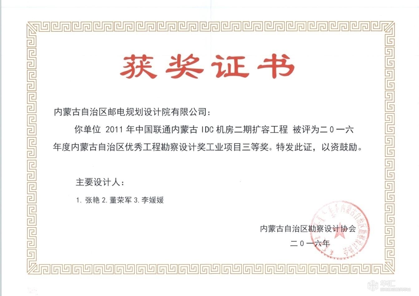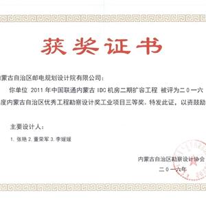 本项目于2016年荣获内蒙古勘察设计协会“2016年度全区优秀工程勘察设计奖工业项目类三等奖”。