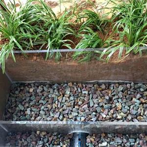现状绿地的地势基本高于现状道路,合理控制竖向标高是本项目的额建设关键,部分建设完善的绿化不宜大面积开挖,故设置卵石槽、植草沟等灵便性大的设施实现绿地与道路的竖向衔接,同时也体现了工程细腻之处。