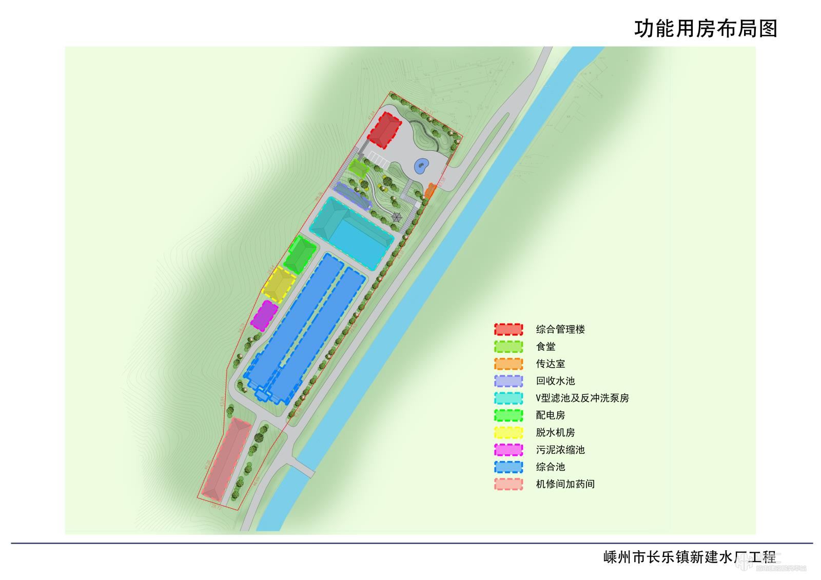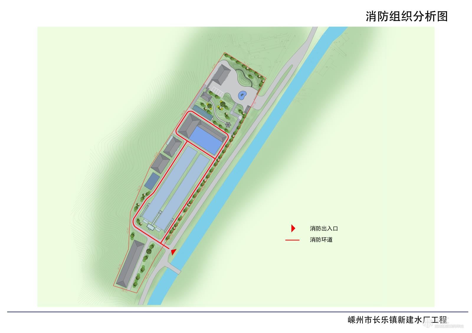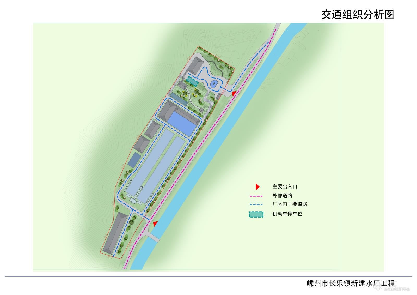 本次新建水厂项目,利用南山水库旁山地,用地相对狭长。总平面从工艺设计的需要出发,合理布局。用地北侧布置综合管理楼、机修间加药间。回收水池、V型滤池及反冲洗泵房、叠合清水池,等位于用地中部。脱水机房,污泥浓缩池及配电房等位于用地南部。同时预留扩展用地。两个出入口均开向东侧规划道路,主入口位于基地东北侧,临近综合管理楼,次入口位于基地东南侧。结合入口布置若干停车位。基地内机动车道环通,满足消防要求。