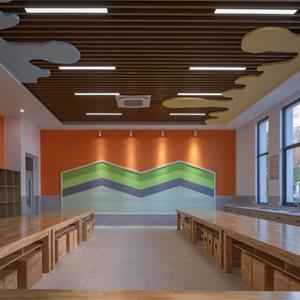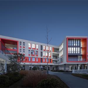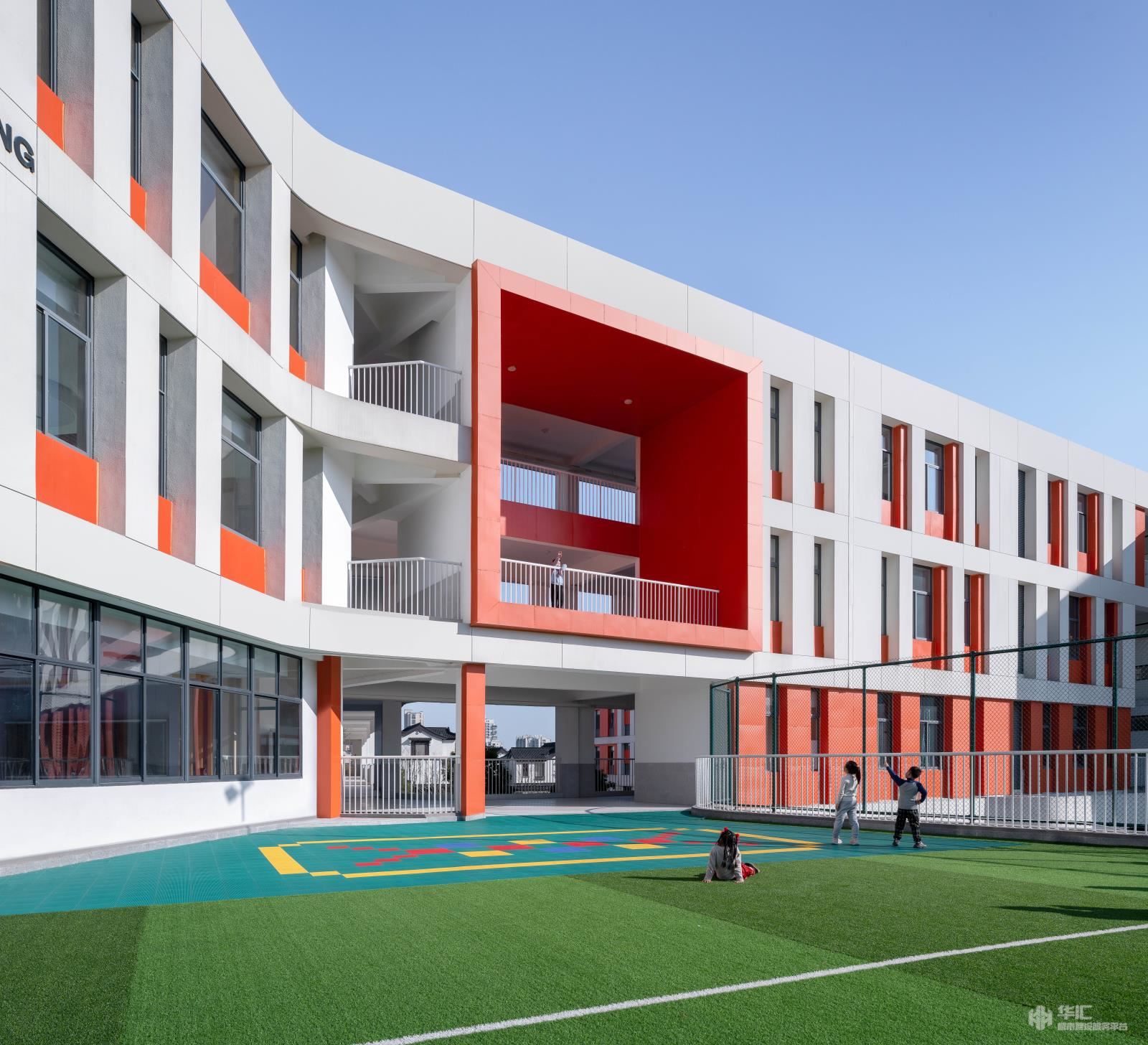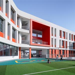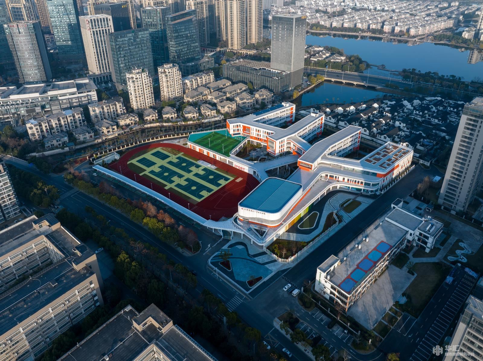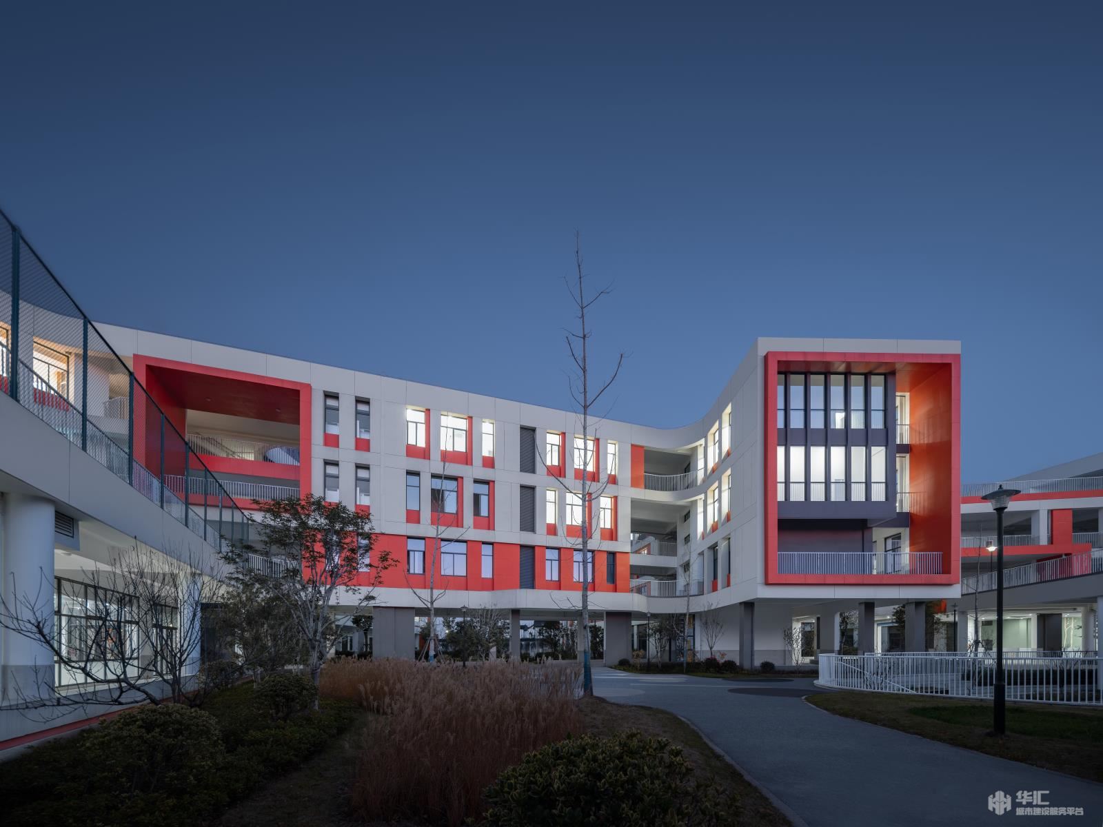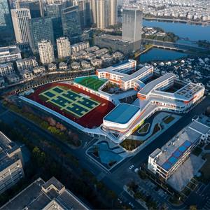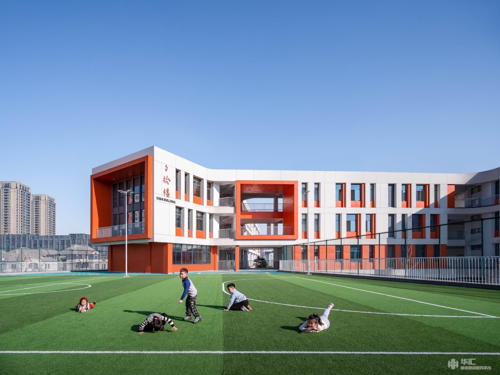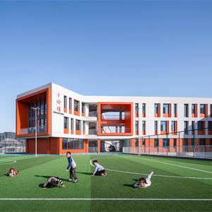 项目用地呈梯形,用地面积为33540 ㎡,以绿地为主,较为平整。以“觅趣之窗”、“乐知之廊”、“探游之庭”为理念,生成“树状生长空间”,创造一个会生长的学习空间,让建筑空间从教室中生长出来,融合在学生们校园生活的日常学习、交流、生活、思考中去,与学生们一起生活成长。