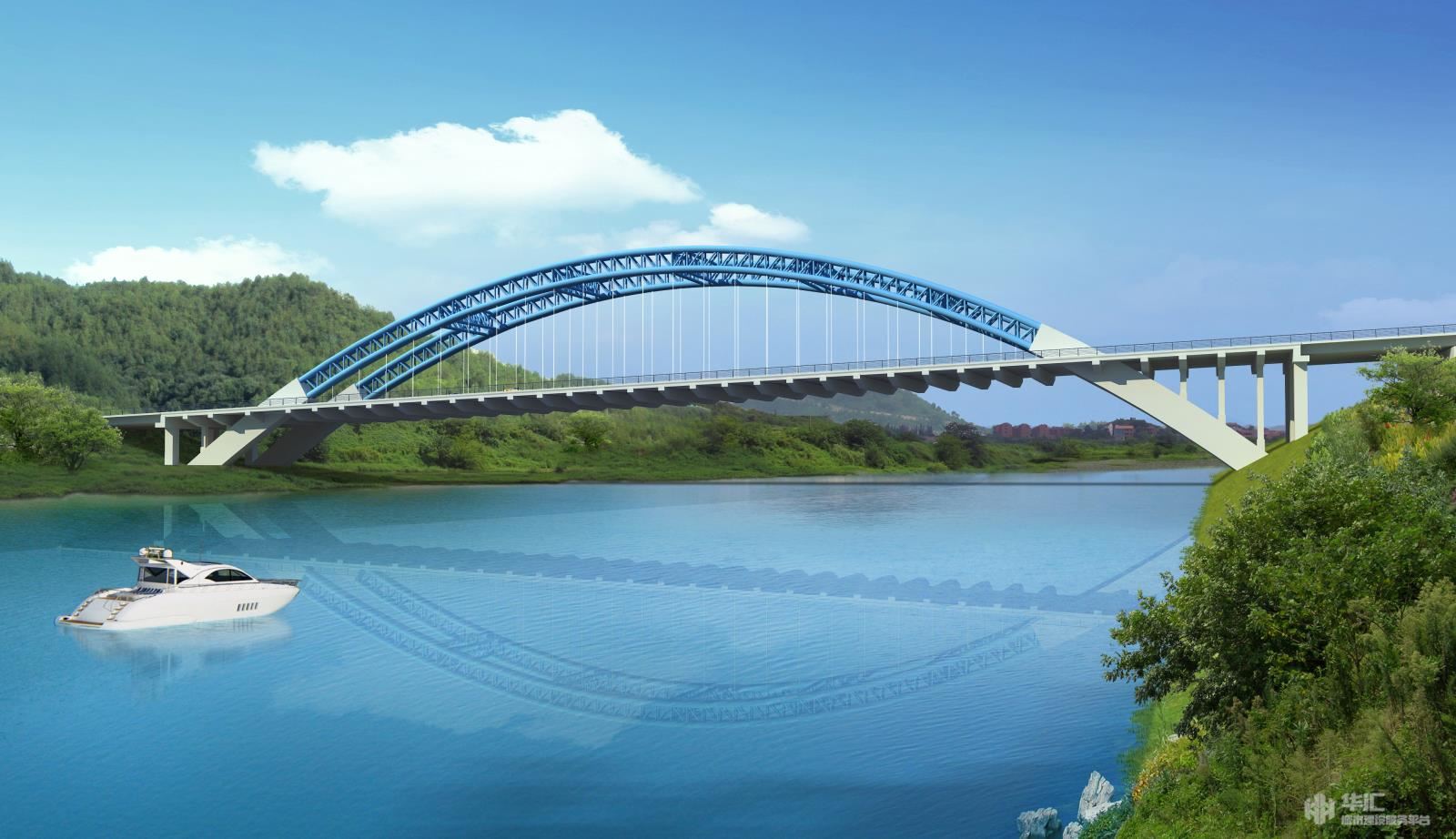 主桥为单跨中承式钢管混凝土拱桥,跨径168m。主拱肋采用悬链线,拱轴系数m=1.5,矢跨比f0/L0=1/4.48。