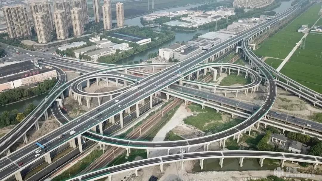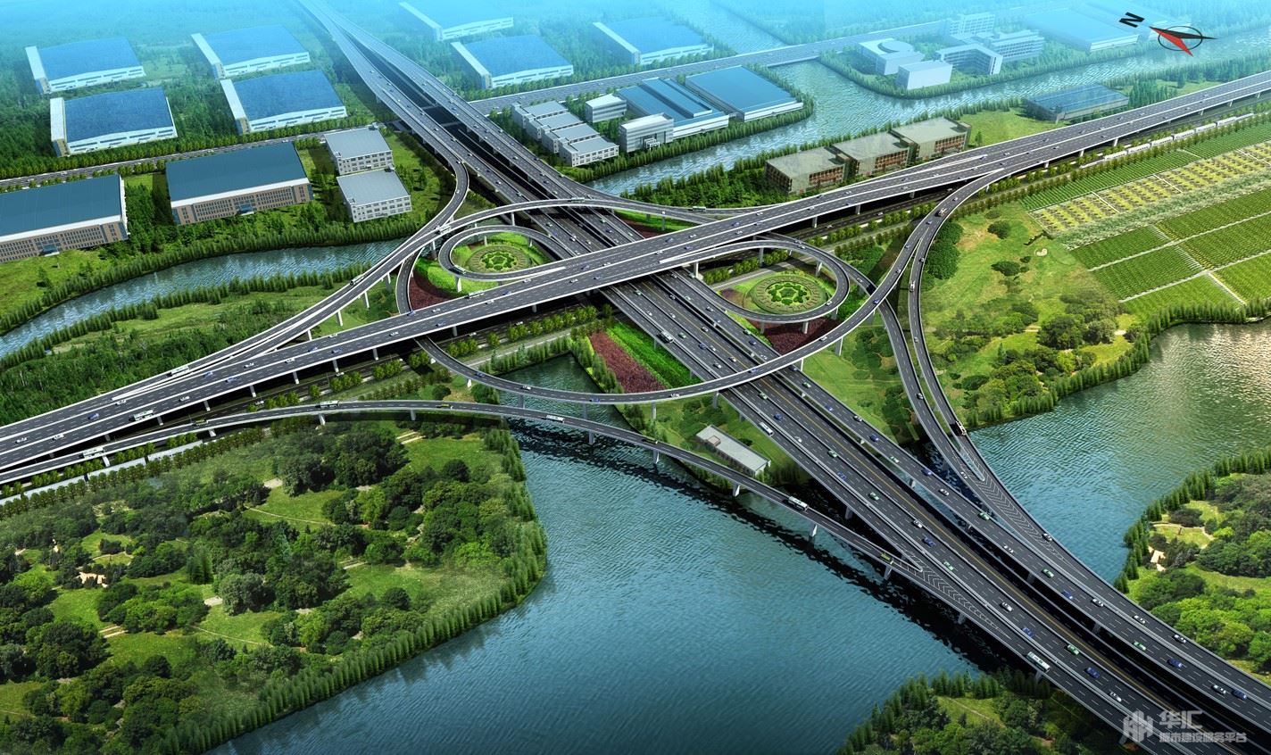 104国道与镜水路互交叉处考虑萧甬铁路、杭甬运河等复杂现场条件,该处采用环形匝道、直连式、半直连式匝道相结合的复合式枢纽型互通立交形式。立交规模大,功能齐全,桥型结构采用了现浇箱梁、钢混结合梁等形式。