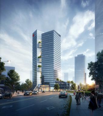 基于本案场地东侧所独具的大滩美景,以此为激发点,在主楼的东侧每两层设置—退台,在其上种满植物,形成共享交流的室外休憩平台,清晰的图解了现代“生态景观型办公楼"的精髓。