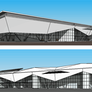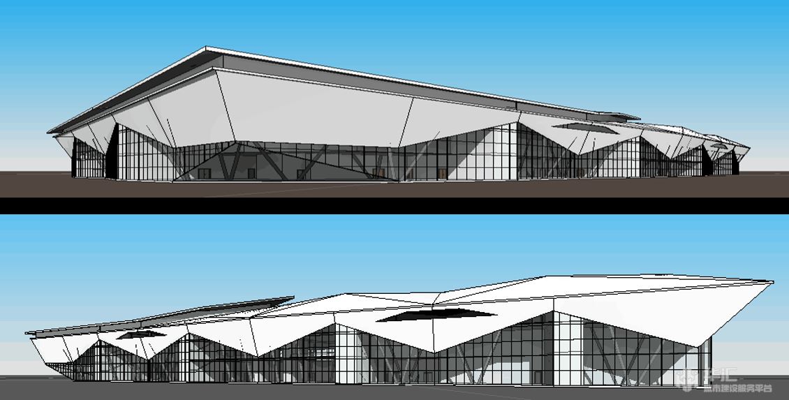 难度三、展览中心的屋面由各个不共面的三角形铝镁锰合金屋面板块拼接而成。透过屋面板,背后是不同坡度和折角的钢梁与檩条的组合,这些结构构件的走向及空间位置与屋面保持一致。为保证建筑效果,结构采用了多种钢结构处理方法,计算和制图都花了相当的精力。