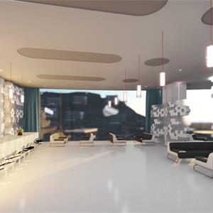 展览中心位于场地东北角南侧紧挨俱乐部大楼,首层为服务运送的物流通道和汽车厂商展厅,二层通往公共广场,内设多种餐饮店铺服务游客大众,三层设有露天阳台。展览中心共4层,建筑总高度19.500m,占地面积4177.65㎡,地上建筑面积12614㎡。