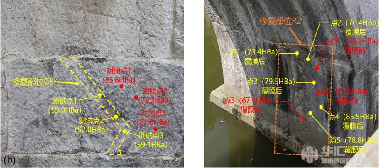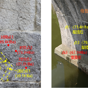 本善桥位于江苏省常州市金坛区金城镇清培村,横跨清培河上,始建于南宋绍兴二十八,为江苏省文物保护单位。该桥原30.18m,现长28.66m(西侧桥局部因道路建设而不存),桥面中间置一独轮车道,宽0.35m,车道两旁铺1米的人行阶石14块,两旁安栏杆基石,桥面两侧各置6根望柱,5块栏板,2块抱鼓石,正中栏板外侧镌有楷书“本善桥”三字。桥以青石砌造,为分节并列式,发券单孔,净跨8m,拱矢高4.7m,拱券分十一节,每节拱石左右对称。拱券宽度自下而上有收分,每节拱券以5块拱石并列组成,顶部中一块合拢石上刻有莲花图案。上下石缝相错,缝间用石灰糯米浆封灌。桥身主体结构为石灰岩材质,部分桥面条石铺装和踏步为花岗岩,少量构件为火山岩。因受风吹雨淋、水流冲刷等作用影响,目前桥身石灰岩构件多处存在风化、开裂、缺损等病害,临河拱石溶蚀现象普遍,亟需修复和保护。现采用微生物注浆和微生物矿化覆膜技术对立面桥身多处裂缝及缺损实施修复,对东、西两侧严重溶蚀拱石进行了微生物矿化覆膜强化加固。