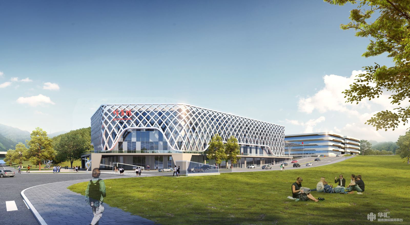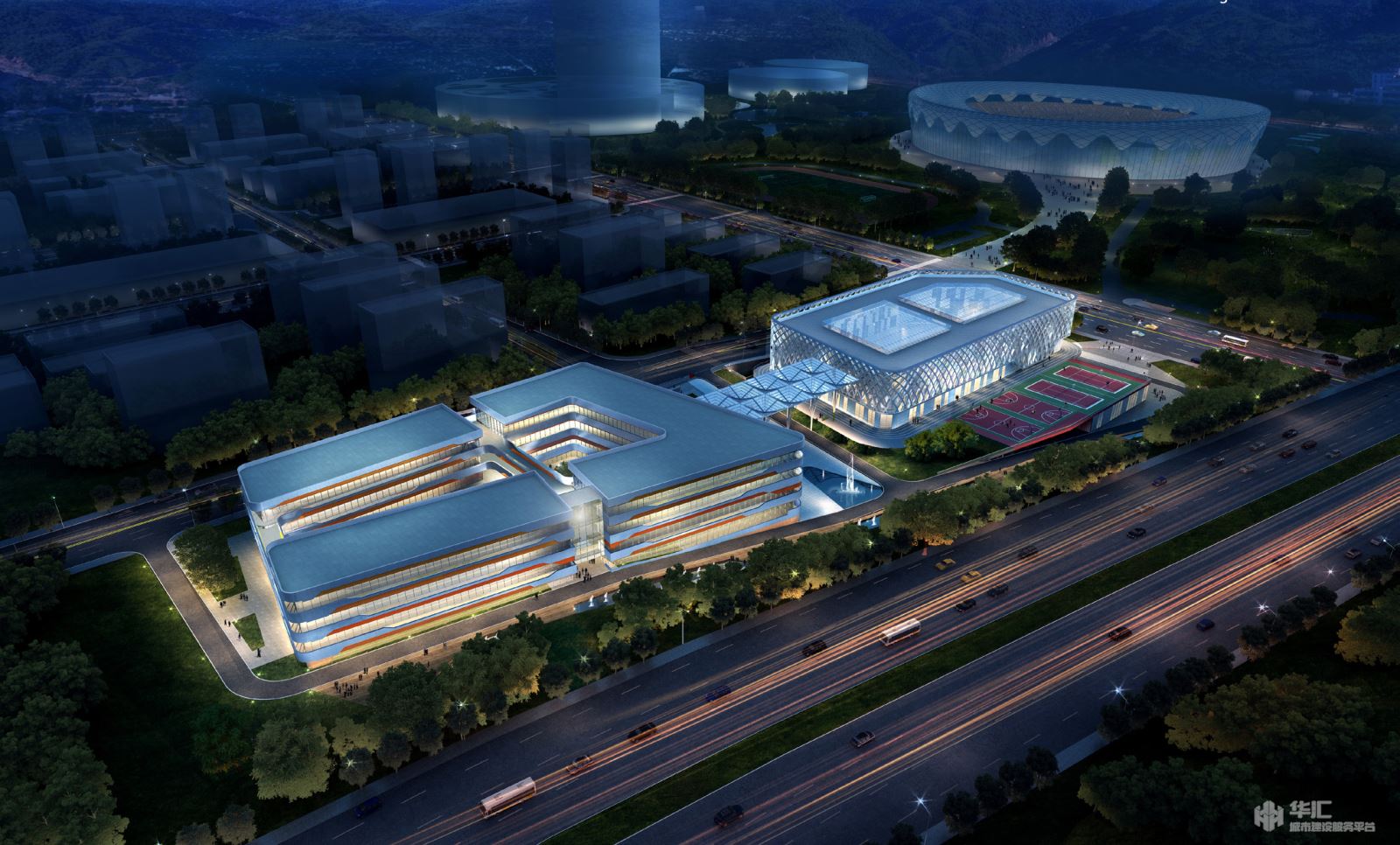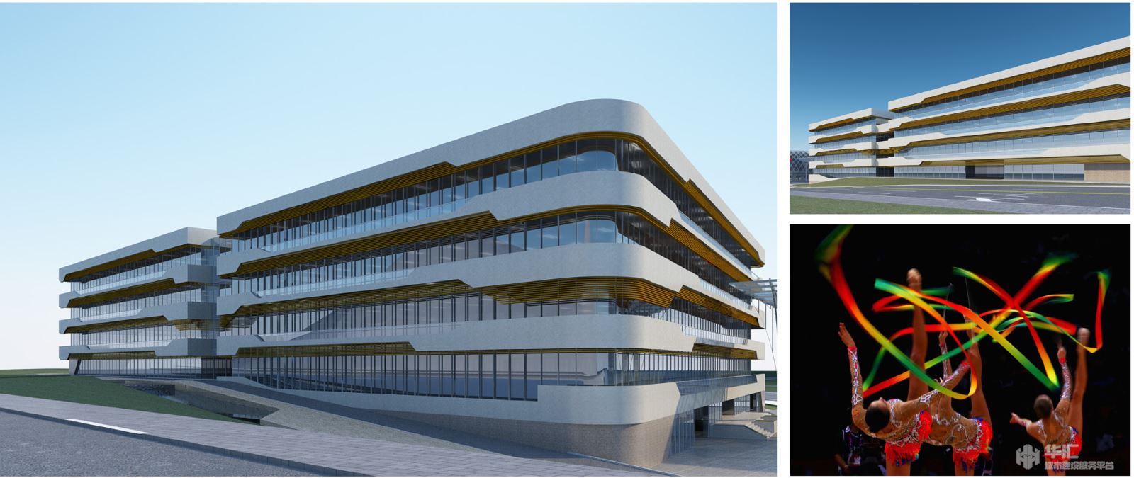 造型轻盈的体育中心犹如漂浮于跑道上的象征体育精神的“白色圣殿”,结合参数化设计,根据不同朝向的日照和遮阳要求,不同的立面变幻出各异的图案,疏密有致,增添了建筑的动感和平衡感。教学及生活区的建筑就如艺术体操运动员手中舞动的彩带瞬间在空中划出一条条多彩的线条,环绕着我们的建筑,表现出艺术和运动完美的结合。